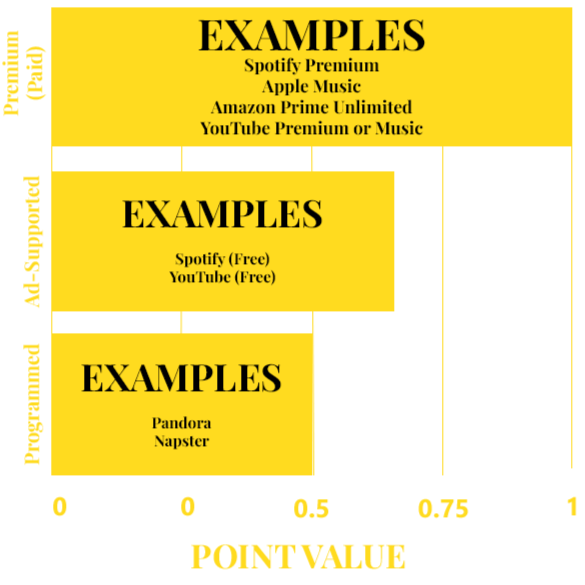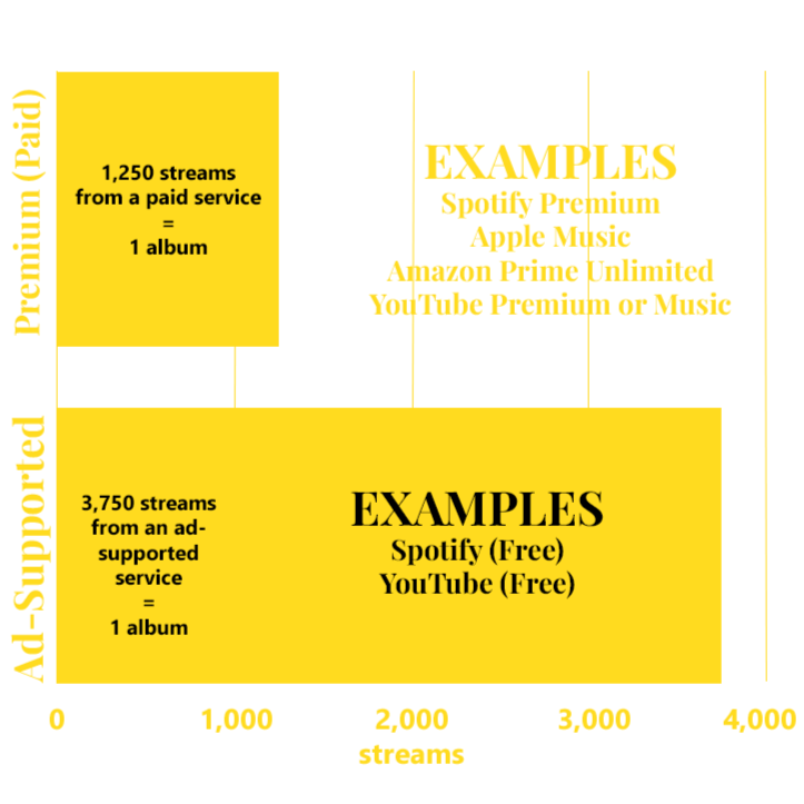 Premium or paid subscriptions (e.g. Spotify Premium, Apple Music, Amazon Music Unlimited, Google Play) weigh more than free streaming services (like YouTube, SoundCloud, Pandora) on the Billboard 200 Album chart and Hot 100 singles chart.